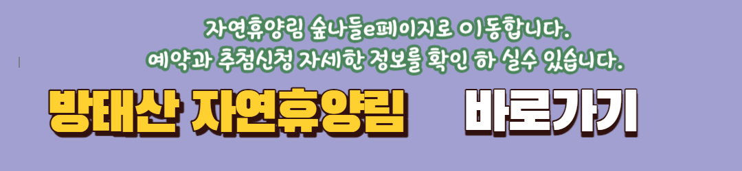 아래 링크를 클릭 하시면 방태산 자연휴양림 예약 사이트인 숲 나들이 e 로 바로 가실 수 있습니다