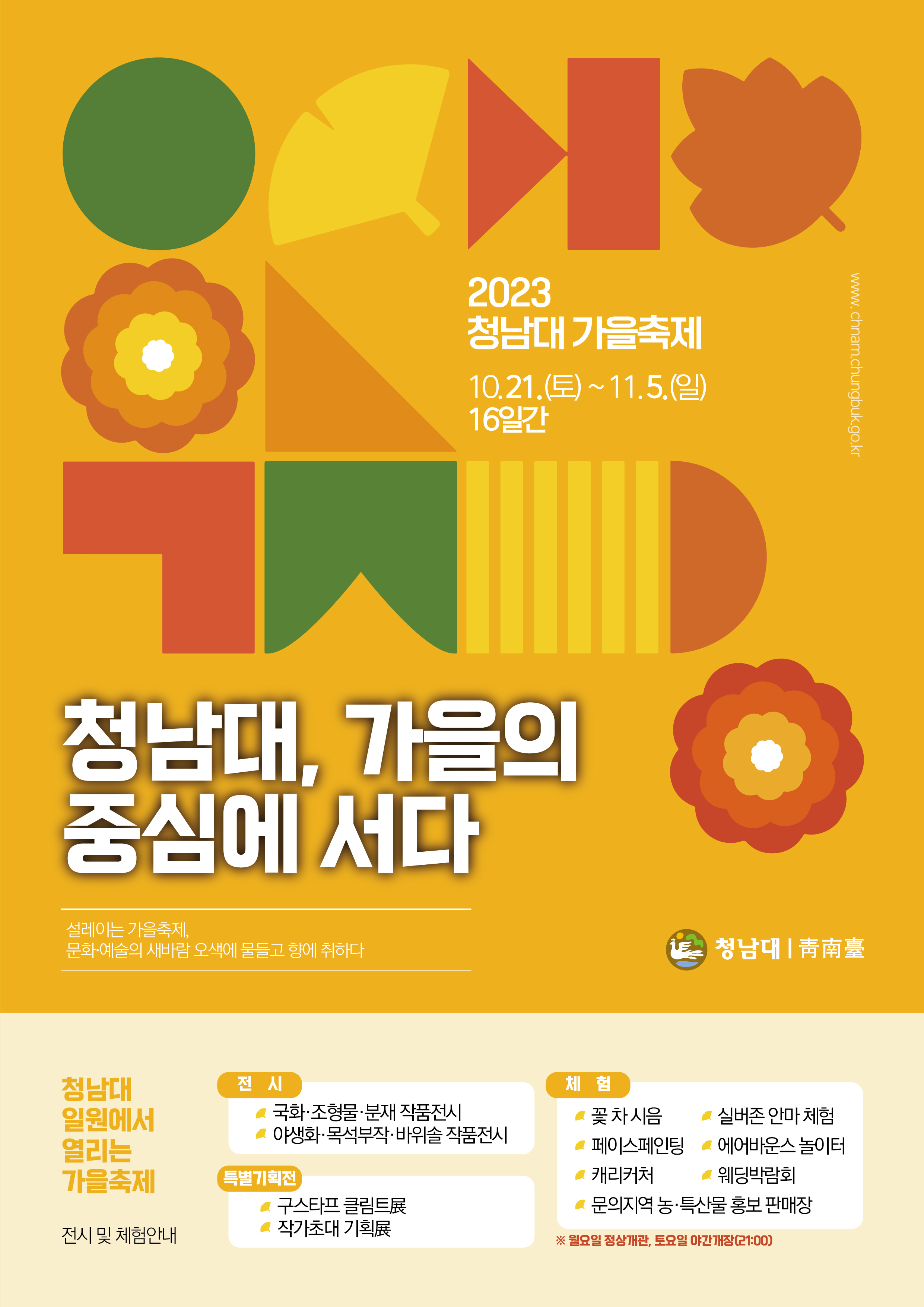 가을은 청남대에서 가장 아름다운 시기입니다. 가을 단풍이 환상적인 풍경을 만들어내며, 다양한 행사들이 개최됩니다. 예를 들어, 황금빛 색채의 비밀 '구스타프클림트전' 전시회와 청남대 가을축제가 매년 열리는데, 이를 통해 예술과 자연을 함께 즐길 수 있습니다. 지금까지 청남대에 대한 소개와 이용안내, 축제 및 체험 프로그램에 대해 알아보았습니다. 청남대는 많은 이들에게 사랑받는 아름다운 장소로, 가족이나 연인과 함께 방문해 아름다운 풍경과 문화를 즐기며 특별한 시간을 보낼 수 있는 곳입니다.