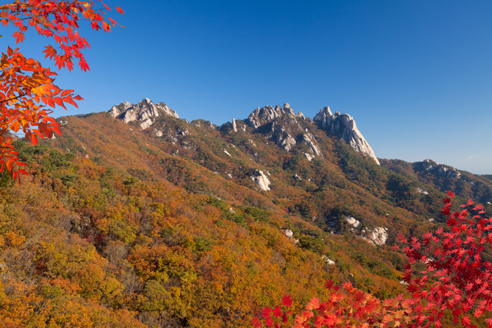 설악산은 국제적으로도 보존 가치를 인정받아 유네스코로부터 생물권보전지역으로 지정되어 있는 곳입니다. 대청봉을 비롯해 소청봉, 중청봉, 화채봉 등 30여 개의 높은 산봉우리가 웅장하게 펼쳐진 특징을 가지고 있습니다. 설악산은 가을 단풍으로 유명한 곳 중 하나로, 예상시기는 10월 6일이며 절정시기는 10월 20일입니다.