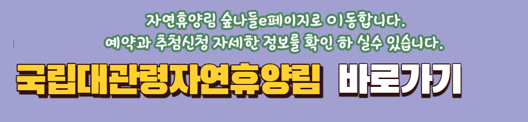 아래 링크를 클릭 하시면 국립 대관령 자연휴양림 예약 사이트인 숲 나들이 e 로 바로 가실 수 있습니다