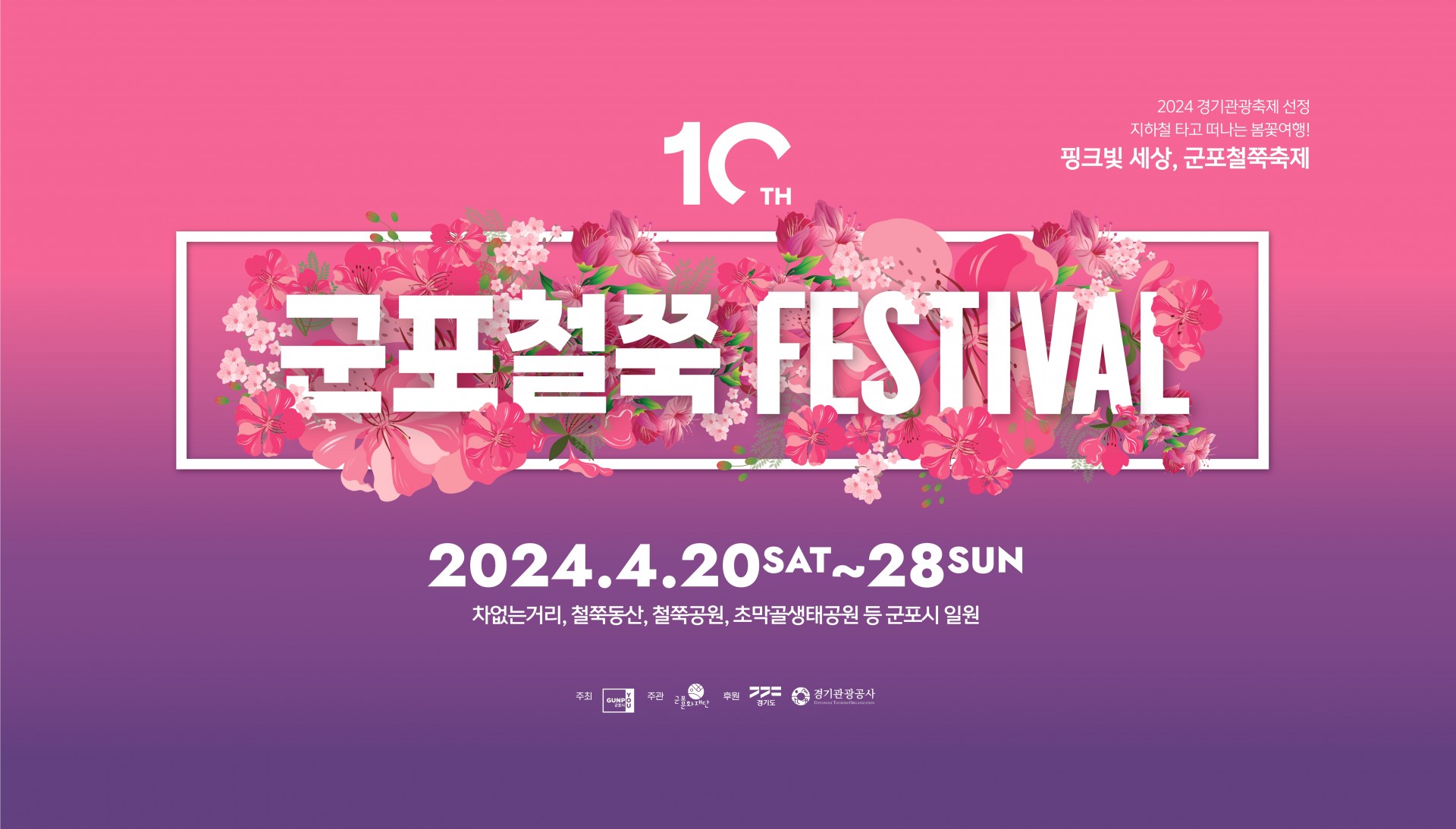 2024 군포 철쭉 축제는 4월 20일부터 28일까지, 총 9일간 군포시 일원에서 진행됩니다. 이 기간 동안 철쭉이 만개하여 분홍빛 천국을 만들어내는 군포시 일원은 차 없는 거리, 철쭉 동산, 철쭉 공원, 초막골 생태공원 등이 메인 장소로 삼아 다양한 이벤트를 진행합니다.