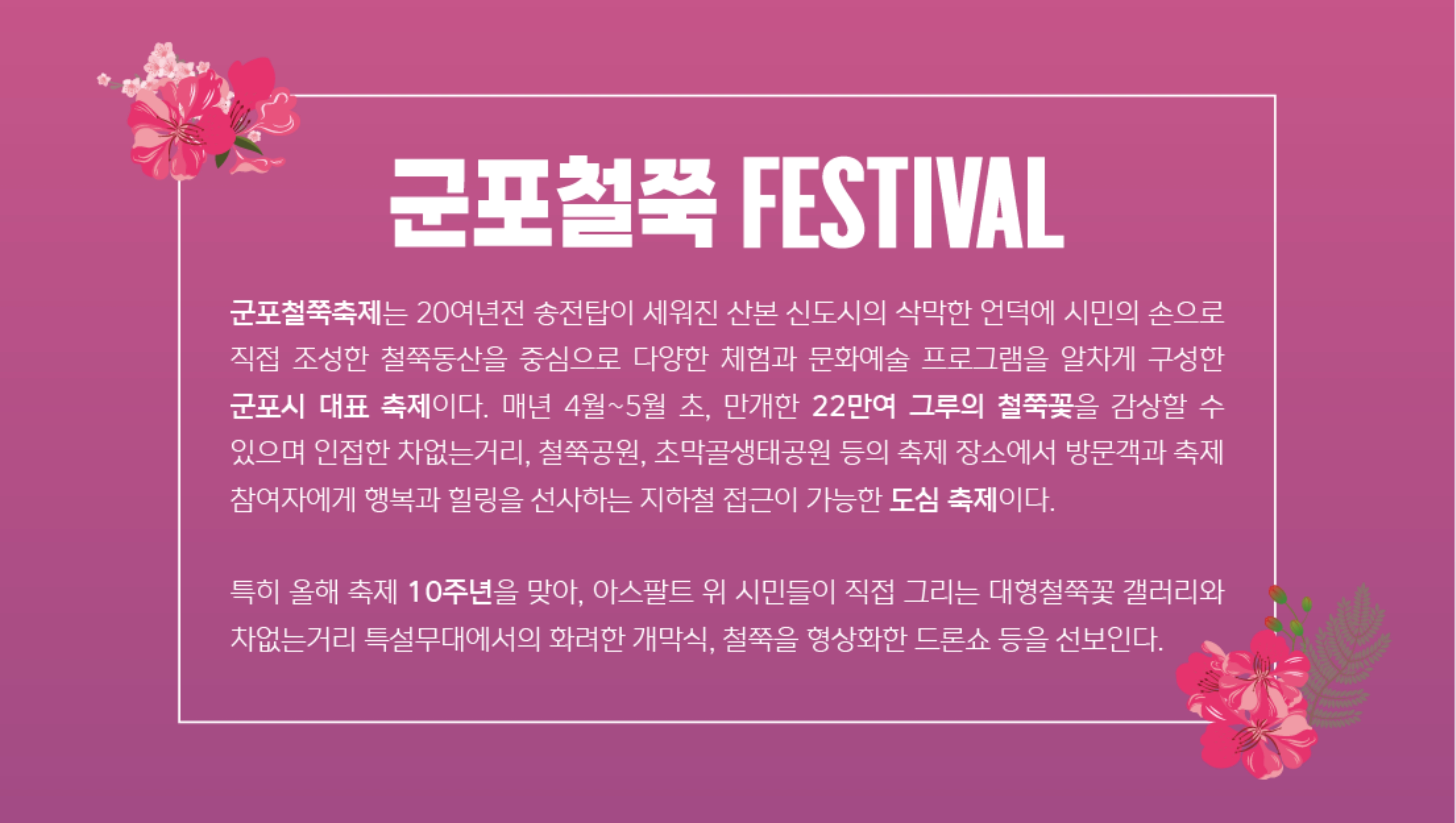철쭉은 봄의 종착역을 장식하는 아름다운 꽃으로, 군포시는 이 철쭉을 이용한 축제를 통해 매년 많은 사람들을 끌어들입니다. 철쭉의 화려한 분홍빛이 군포시 일원을 물들이면, 분주한 도시의 몸살을 달래주는 치유의 시간이 찾아옵니다.