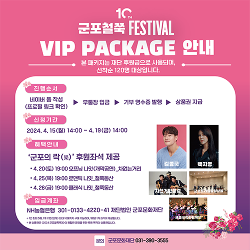 축제 기간 동안, 개막식을 시작으로 다양한 프로그램이 준비되어 있습니다. '군포의 맛'에서는 군포 지역의 특산물을 활용한 먹거리를 맛볼 수 있으며, '군포의 멋'에서는 철쭉을 활용한 다양한 상품들을 만나볼 수 있습니다. 또한, '군포의 락'에서는 다양한 공연과 체험 프로그램을 즐길 수 있습니다.